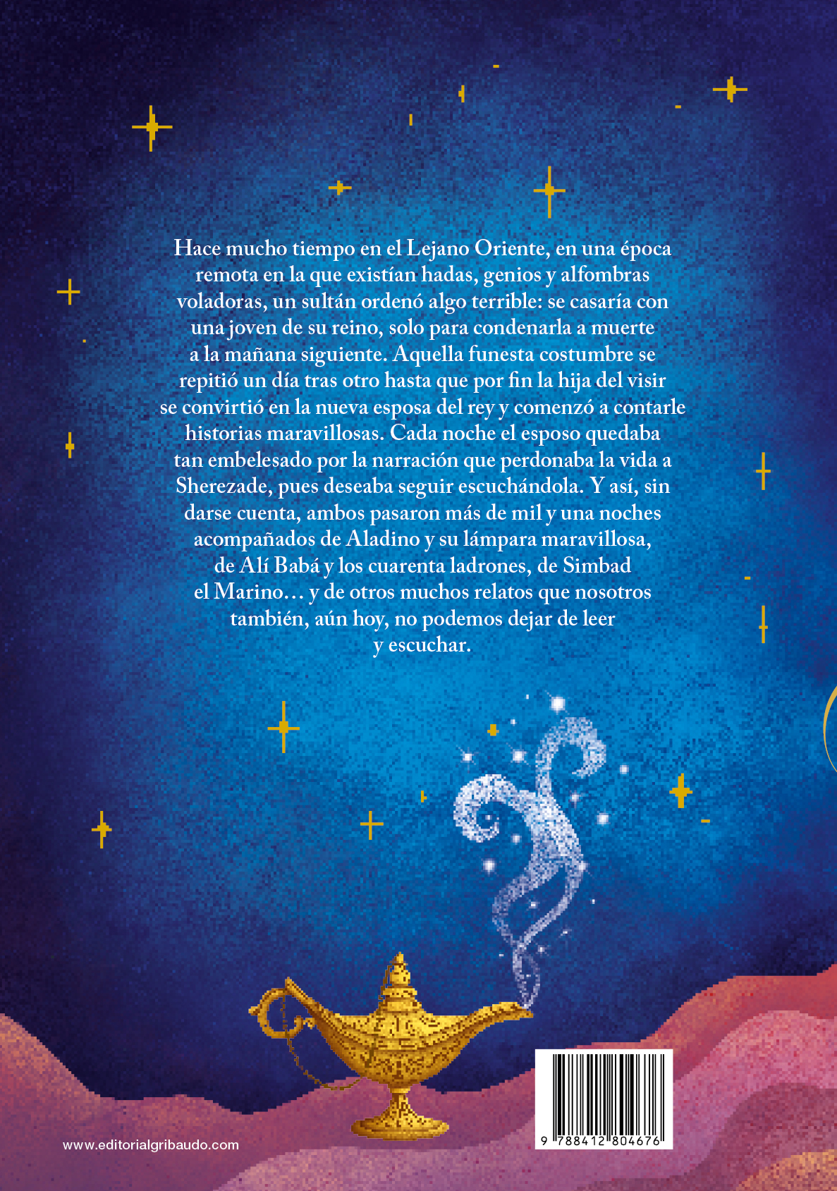 Hace mucho tiempo en el Lejano Oriente, en una época remota en la que existían hadas, genios y alfombras voladoras, un sultán ordenó algo terrible: se casaría con una joven de su reino, solo para condenarla a muerte a la mañana siguiente. Aquella funesta costumbre se repitió un día tras otro hasta que por fin la hija del visir se convirtió en la nueva esposa del rey y comenzó a contarle historias maravillosas. Cada noche el esposo quedaba tan embelesado por la narración que perdonaba la vida a Sherezade, pues deseaba seguir escuchándola. Y así, sin darse cuenta, ambos pasaron más de mil y una noches acompañados de Aladino y su lámpara maravillosa, de Alí Babá y los cuarenta ladrones, de Simbad el Marino… y de otros muchos relatos que nosotros también, aún hoy, no podemos dejar de leer y escuchar.