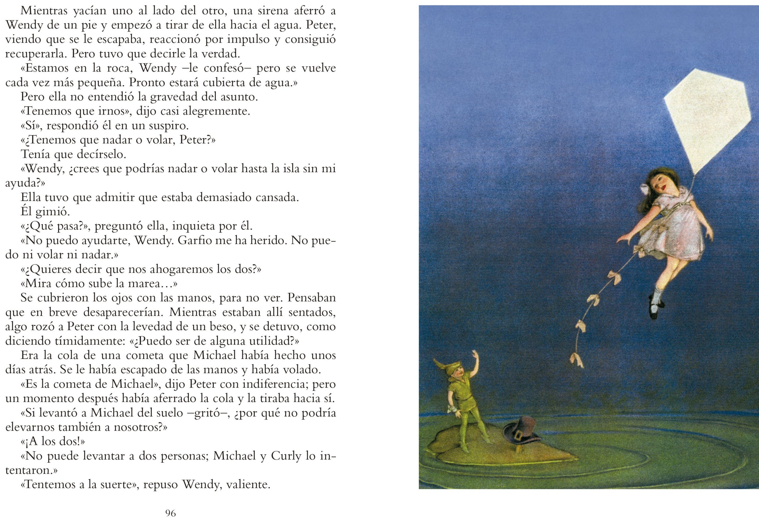 Peter Pan, el niño que no quiere crecer, tiene el poder de volar y vive en una isla mágica. Pero es un apasionado de los cuentos, así que cada noche acude a Londres para oír los que cuenta una madre a sus hijos al acostarlos. En una de sus visitas pierde su sombra y cuando Wendy, la niña de la casa, se la cose por los pies, el chico la invita a volar con él al País de Nunca Jamás. Allí vivirán las mil peripecias que durante más de un siglo han conquistado a generaciones de lectores y siguen fascinando a los más pequeños.